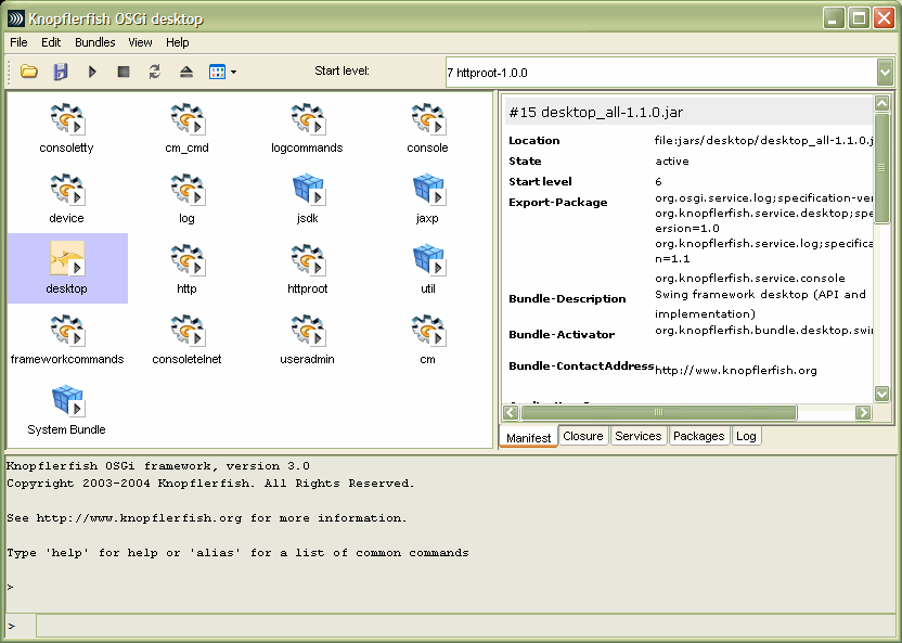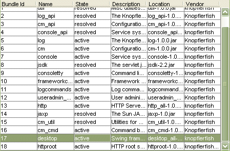 The Knopflerfish OSGi Desktop displays a graphical overview of the OSGi framework. Most common operations as install, start, stop and update can be performed on bundles using the desktop. Additionally, bundle and service detail information is shown, and an experimental "Save deploy archive" is included.