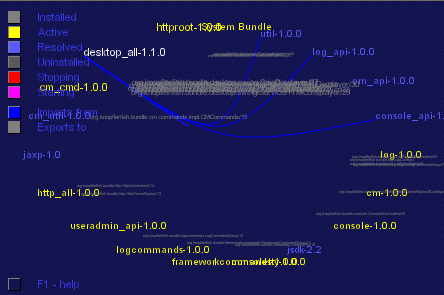 Dependencies between bundles and services are shown as connecting lines. Not how the console bundle depends on three other bundles in the image above.