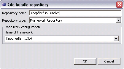 Bundle repositories are used when searching for bundles. The plug-in searches for bundles to find packages available for import by bundle projects, to find bundles to add to a bundle projects build path and to find bundles to add to launch configurations. In order to have any bundles available you need to set up at least one repository. The repositories are searched in the order they are listed. Only repositories which are checked, i.e. marked as active, are searched.