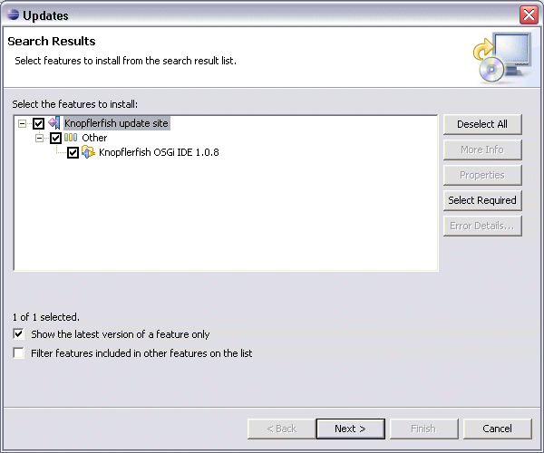 Check the box for Knopflerfish update site and press finish. If the update site is found you will see the features available on this site. Check the Knopflerfish OSGi IDE you wish to install.