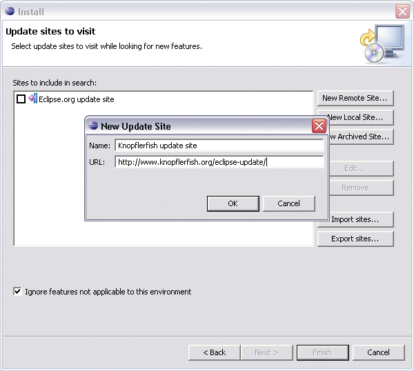 Create a 'New Remote Site...'. Enter name, e.g. 'Knopflerfish update site', and URL 'http://www.knopflerfish.org/eclipse-update/'.